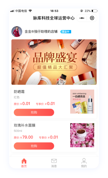 个人店铺+推广码系统 品牌帮助代理开拓独立个人店 铺+推广码系统打破朋友圈卖 货壁垒,从而实现快速拓宽引 流渠道!帮助品牌方快速促活 老用户,刺激拉新新用户!